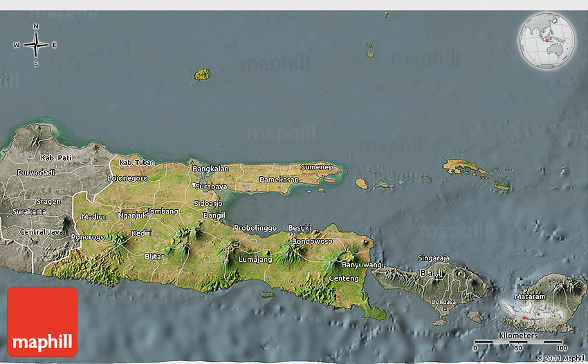 Satellite map shows the Earth's surface as it really looks like. The above map is based on satellite images taken on July 2004. This satellite map of East Java is meant for illustration purposes only. For more detailed maps based on newer satellite and aerial images switch to a detailed map view.