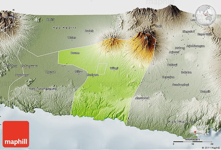 Physical map illustrates the mountains, lowlands, oceans, lakes and rivers and other physical landscape features of Kab. Blitar. Differences in land elevations relative to the sea level are represented by color.