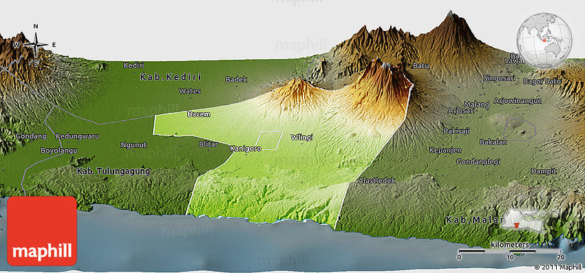 The panoramic physical map represents one of several map types and styles available. Look at Kab. Blitar, East Java, Indonesia from different perspectives.