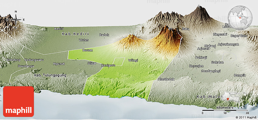 The panoramic physical map represents one of several map types and styles available. Look at Kab. Blitar, East Java, Indonesia from different perspectives.