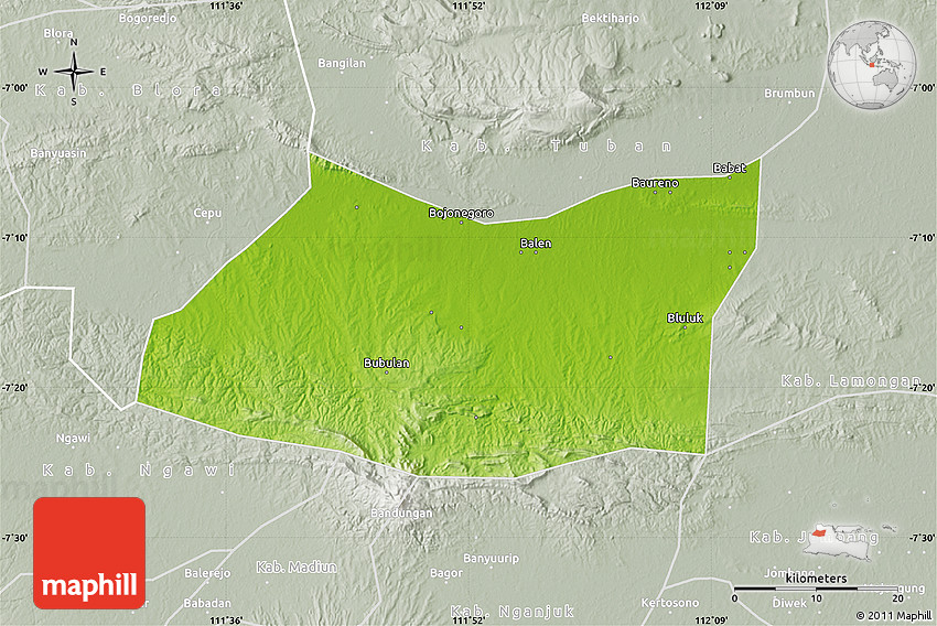 Maphill is a collection of map images. This physical map of Kab. Bojonegoro is one of them. Click on the Detailed button under the image to switch to a more detailed map.