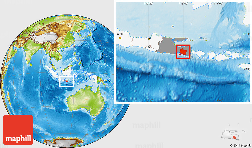 Maphill is a collection of map images. This image combines a physical map with the globe centered on Kab. Jember. Use the buttons under the image to switch to different map types.