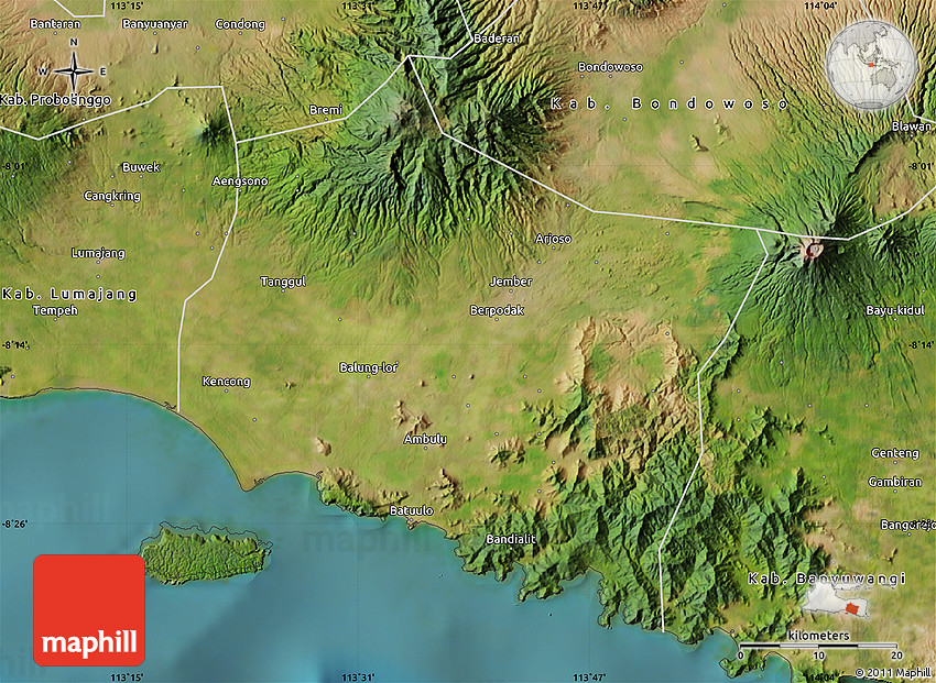Maphill is a collection of map images. This satellite map of Kab. Jember is one of them. Click on the Detailed button under the image to switch to a more detailed map.