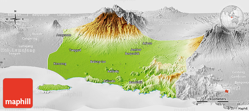 The panoramic physical map represents one of several map types and styles available. Look at Kab. Jember, East Java, Indonesia from different perspectives.