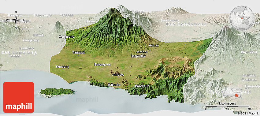 Each map type offers different information and each map style is designed for a different purpose. Read about the styles and map projection used in the above map (Satellite Panoramic Map of Kab. Jember, lighten).