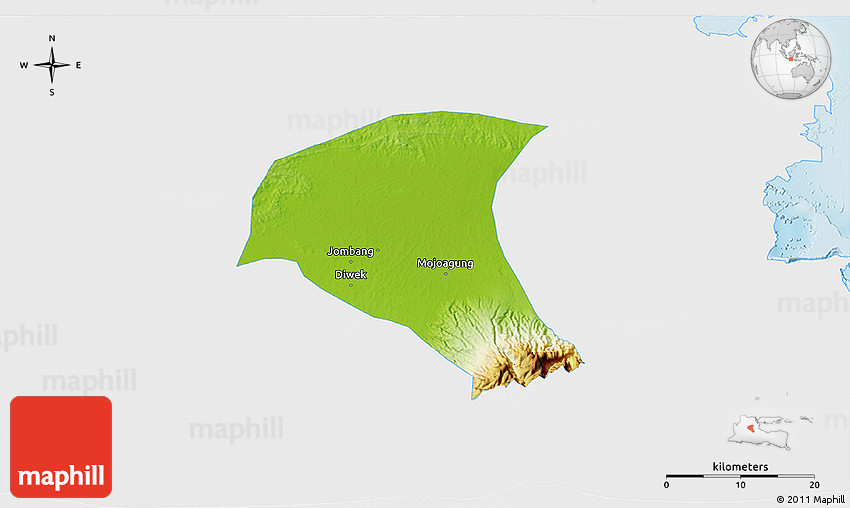 Physical map illustrates the mountains, lowlands, oceans, lakes and rivers and other physical landscape features of Kab. Jombang. Differences in land elevations relative to the sea level are represented by color.