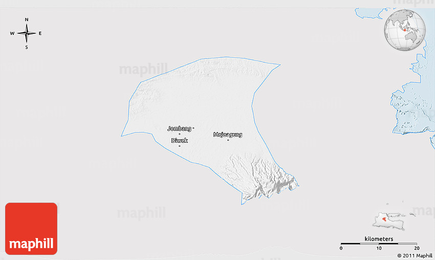 Each map type offers different information and each map style is designed for a different purpose. Read about the styles and map projection used in the above map (Silver Style 3D Map of Kab. Jombang, single color outside).