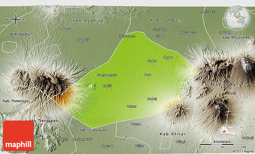 Physical map illustrates the mountains, lowlands, oceans, lakes and rivers and other physical landscape features of Kab. Kediri. Differences in land elevations relative to the sea level are represented by color.
