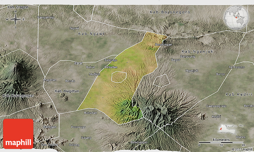 Satellite map shows the Earth's surface as it really looks like. The above map is based on satellite images taken on July 2004. This satellite map of Kab. Madiun is meant for illustration purposes only. For more detailed maps based on newer satellite and aerial images switch to a detailed map view.