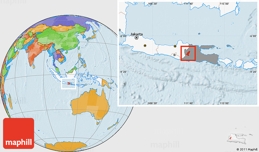 Maphill is a collection of map images. This image combines a political map with the globe centered on Kab. Madiun. Use the buttons under the image to switch to different map types.