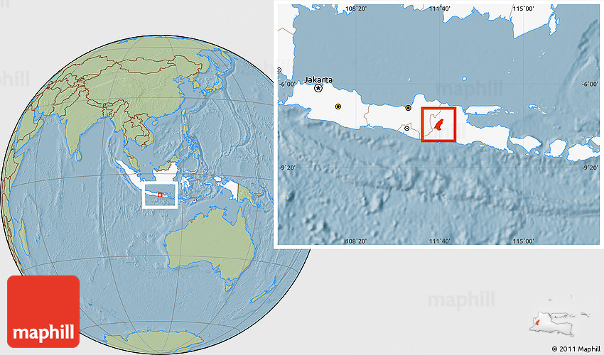 The location map of Kab. Madiun combines two projections: the orthographic azimuthal projection for the globe and the simple geographic projection for the rectangular part of the map. Geographic projection has straight meridians and parallels, each degree of latitude and longitude is the same size over the entire world map.
