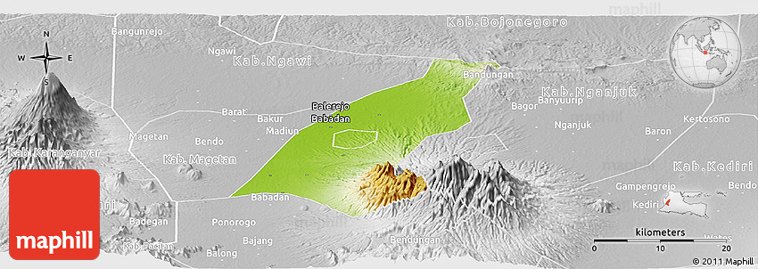 The panoramic physical map represents one of several map types and styles available. Look at Kab. Madiun, East Java, Indonesia from different perspectives.