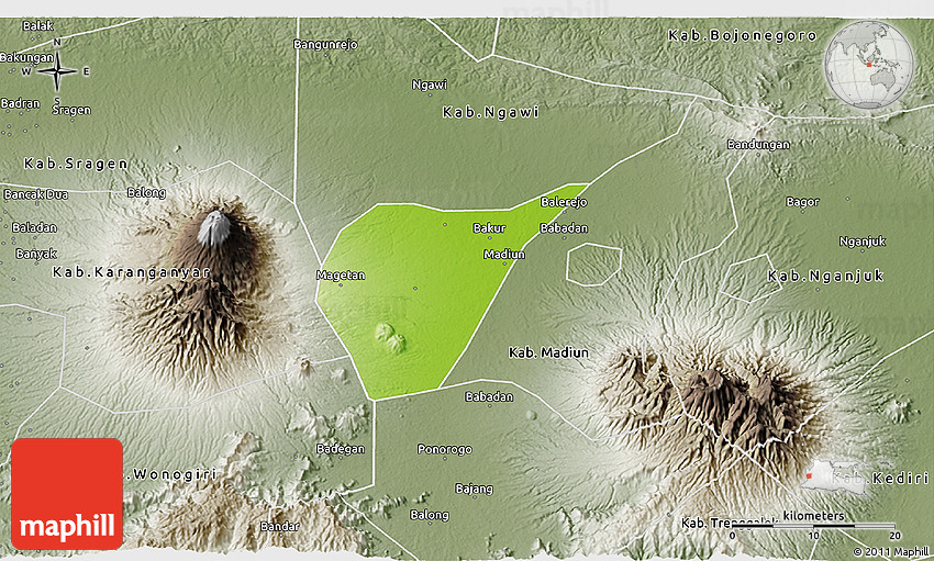 Physical map illustrates the mountains, lowlands, oceans, lakes and rivers and other physical landscape features of Kab. Magetan. Differences in land elevations relative to the sea level are represented by color.