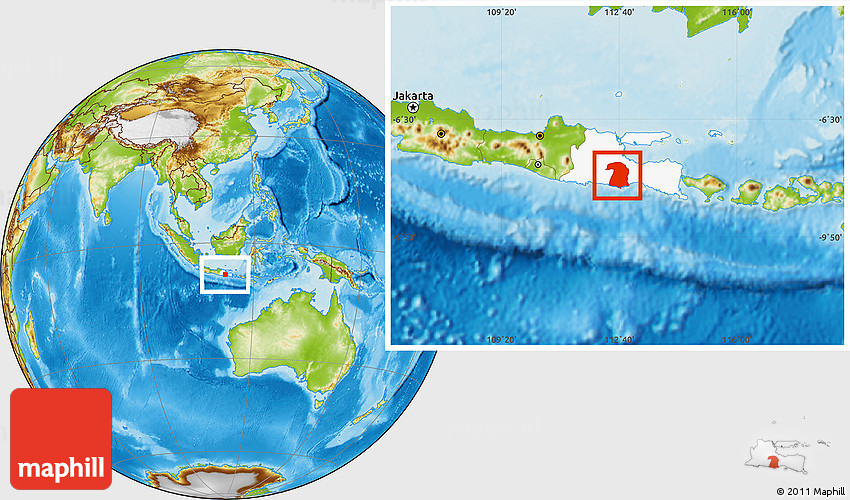 Maphill is a collection of map images. This image combines a physical map with the globe centered on Kab. Malang. Use the buttons under the image to switch to different map types.