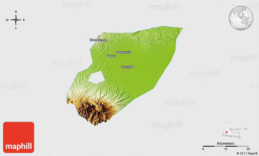 Physical map illustrates the mountains, lowlands, oceans, lakes and rivers and other physical landscape features of Kab. Nganjuk. Differences in land elevations relative to the sea level are represented by color.