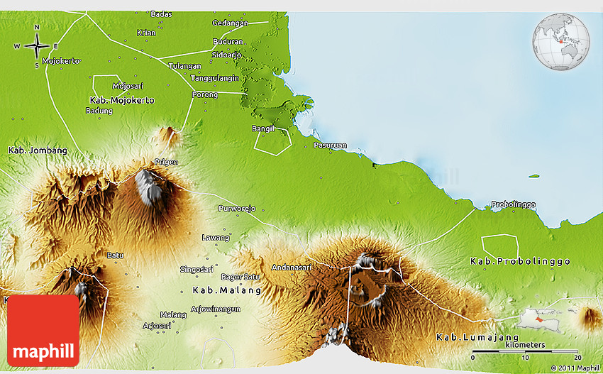 Physical map illustrates the mountains, lowlands, oceans, lakes and rivers and other physical landscape features of Kab. Pasuruan. Differences in land elevations relative to the sea level are represented by color.