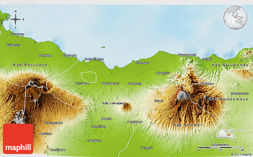 Physical map illustrates the mountains, lowlands, oceans, lakes and rivers and other physical landscape features of Kab. Probolinggo. Differences in land elevations relative to the sea level are represented by color.