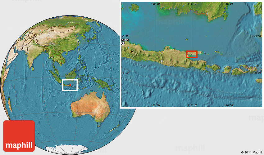 Maphill is a collection of map images. This image combines a satellite map with the globe centered on Banjarkemuning. Use the buttons under the image to switch to different map types.