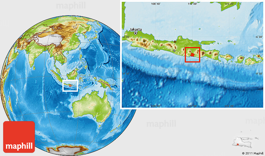 Maphill is a collection of map images. This image combines a physical map with the globe centered on Kab. Tulungagung. Use the buttons under the image to switch to different map types.