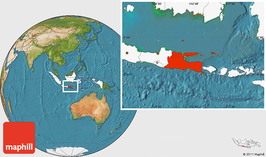 Maphill is a collection of map images. This image combines a satellite map with the globe centered on East Java. Use the buttons under the image to switch to different map types.