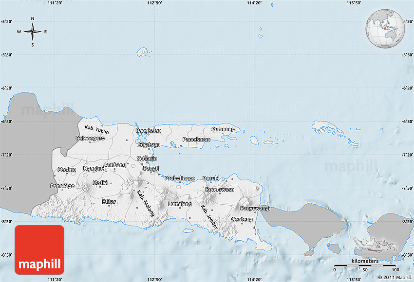 Maphill is a collection of map images. This gray map of East Java is one of them. Click on the Detailed button under the image to switch to a more detailed map.