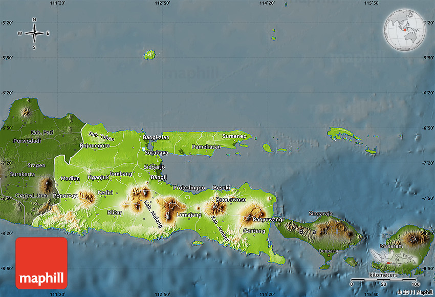 Physical map illustrates the mountains, lowlands, oceans, lakes and rivers and other physical landscape features of East Java. Differences in land elevations relative to the sea level are represented by color.