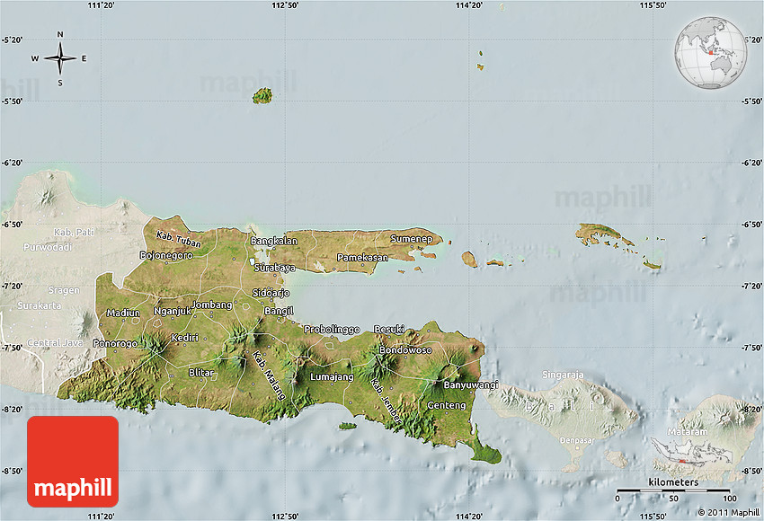 Maphill is a collection of map images. This satellite map of East Java is one of them. Click on the Detailed button under the image to switch to a more detailed map.