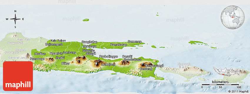 Physical map illustrates the mountains, lowlands, oceans, lakes and rivers and other physical landscape features of East Java. Differences in land elevations relative to the sea level are represented by color.