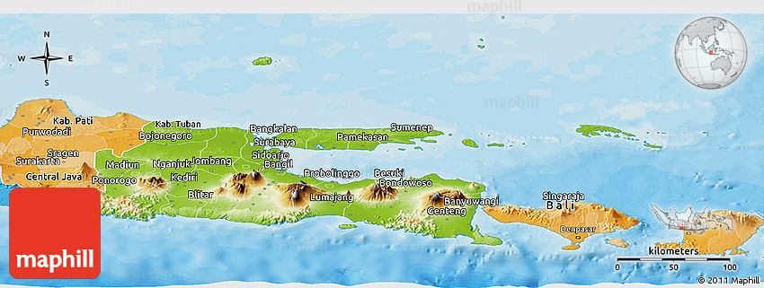 The panoramic physical map represents one of many map types and styles available. Look at East Java from different perspectives.