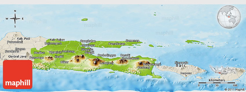 The panoramic physical map represents one of many map types and styles available. Look at East Java from different perspectives.
