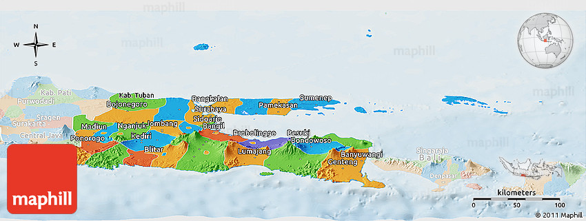 Embed the above political panoramic map of East Java into your website. Enrich your blog with quality map graphics. Make the web a more beautiful place.