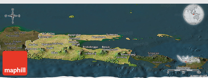 The panoramic satellite map represents one of many map types and styles available. Look at East Java from different perspectives.