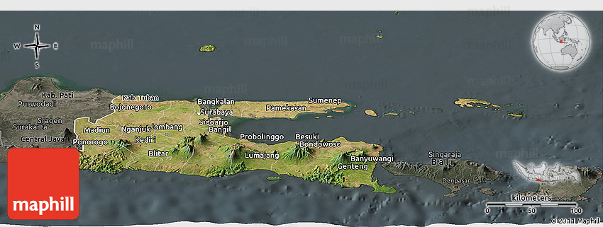 The panoramic satellite map represents one of many map types and styles available. Look at East Java from different perspectives.