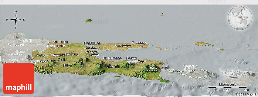 The panoramic satellite map represents one of many map types and styles available. Look at East Java from different perspectives.