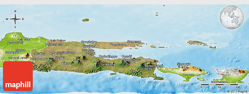 Physical map illustrates the mountains, lowlands, oceans, lakes and rivers and other physical landscape features of East Java. Differences in land elevations relative to the sea level are represented by color.