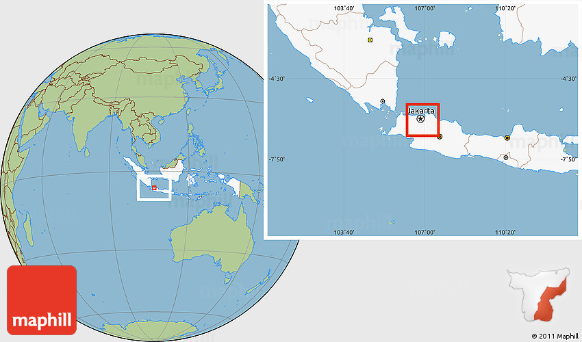 The location map of Kodya. Jakarta Selatan combines two projections: the orthographic azimuthal projection for the globe and the simple geographic projection for the rectangular part of the map. Geographic projection has straight meridians and parallels, each degree of latitude and longitude is the same size over the entire world map.