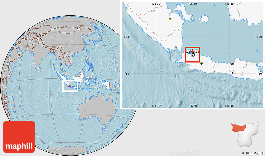 Maphill is a collection of map images. This image combines a gray map with the globe centered on Kodya. Jakarta Utara. Use the buttons under the image to switch to different map types.