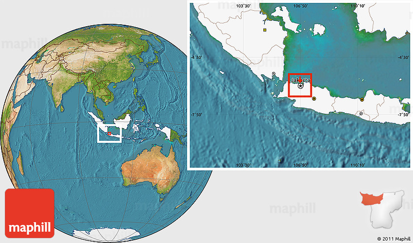 Maphill is a collection of map images. This image combines a satellite map with the globe centered on Kodya. Jakarta Utara. Use the buttons under the image to switch to different map types.