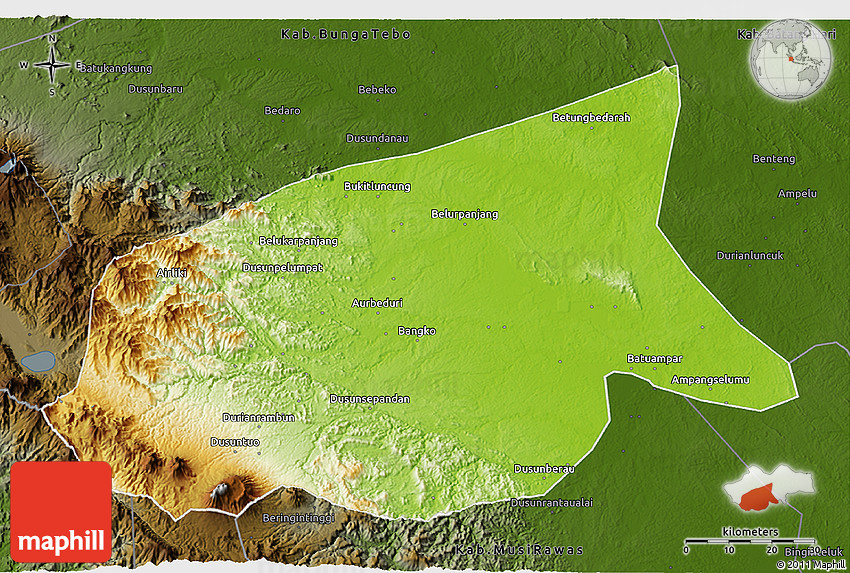 Physical map illustrates the mountains, lowlands, oceans, lakes and rivers and other physical landscape features of Kab. Sarolangun Bangko. Differences in land elevations relative to the sea level are represented by color.