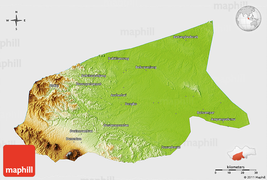 Physical map illustrates the mountains, lowlands, oceans, lakes and rivers and other physical landscape features of Kab. Sarolangun Bangko. Differences in land elevations relative to the sea level are represented by color.