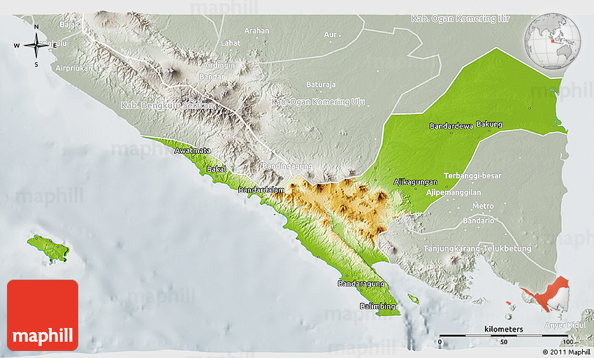 Physical map illustrates the mountains, lowlands, oceans, lakes and rivers and other physical landscape features of Kab. Lampung Utara. Differences in land elevations relative to the sea level are represented by color.