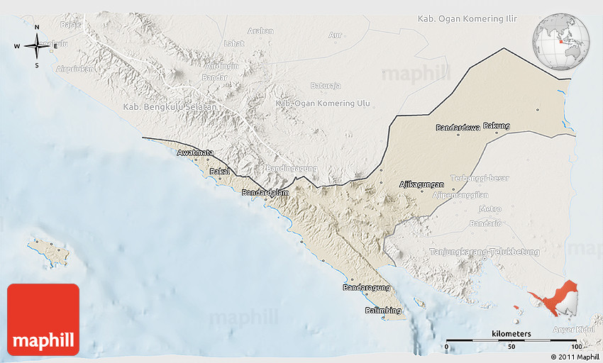 Shaded relief map shows landscape features, such as mountains, valleys and plateaus. Flat areas are smooth on the map, areas with steep slopes and mountains appear more rough. The above map of Kab. Lampung Utara was created using a digital elevation model.