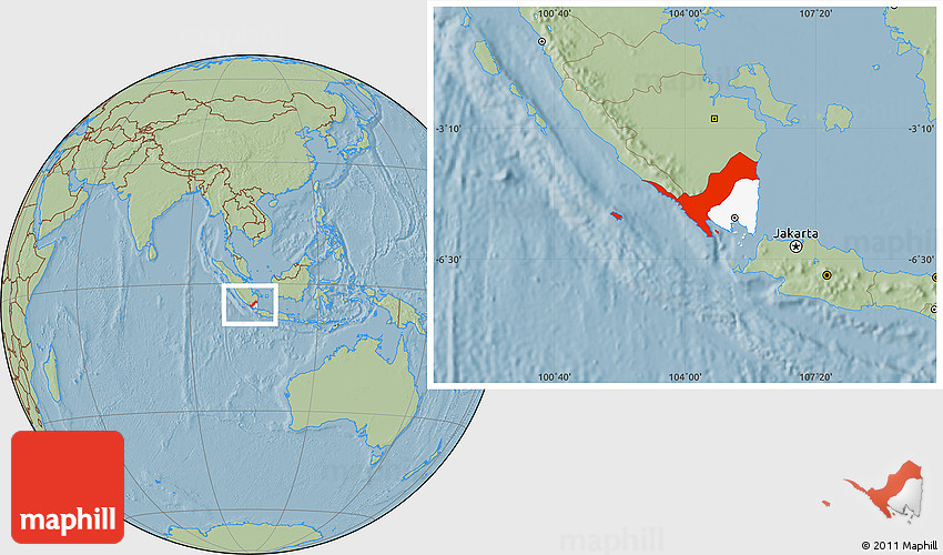 The location map of Kab. Lampung Utara combines two projections: the orthographic azimuthal projection for the globe and the simple geographic projection for the rectangular part of the map. Geographic projection has straight meridians and parallels, each degree of latitude and longitude is the same size over the entire world map.