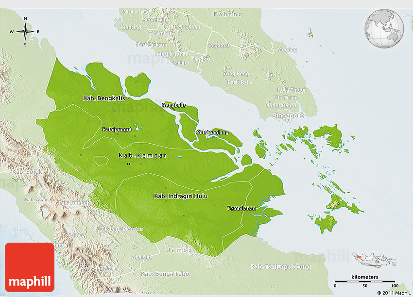 Physical map illustrates the mountains, lowlands, oceans, lakes and rivers and other physical landscape features of Riau. Differences in land elevations relative to the sea level are represented by color.