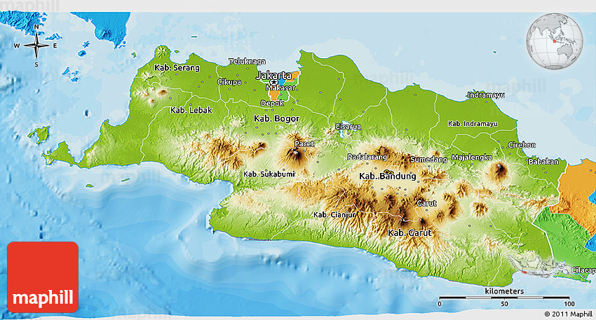 Physical map illustrates the mountains, lowlands, oceans, lakes and rivers and other physical landscape features of West Java. Differences in land elevations relative to the sea level are represented by color.