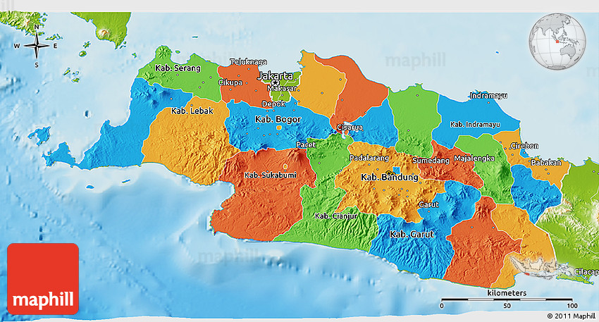 The 3D political map represents one of many map types and styles available. Look at West Java from different perspectives.