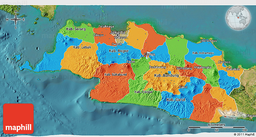 The 3D political map represents one of many map types and styles available. Look at West Java from different perspectives.