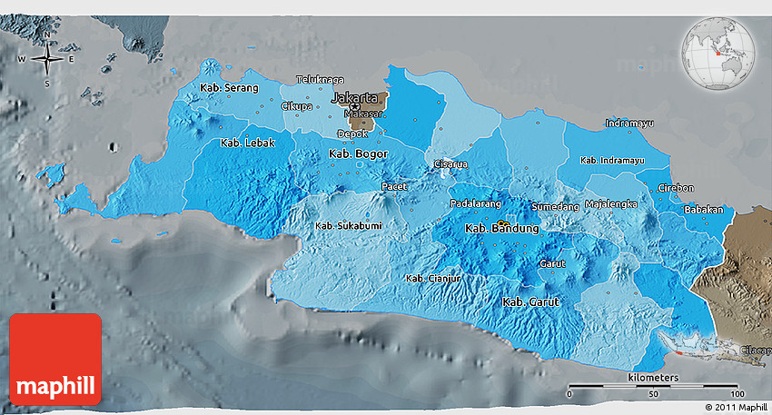 The 3D political shades map represents one of many map types and styles available. Look at West Java from different perspectives.