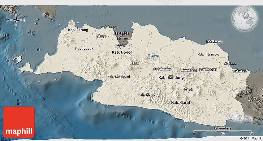 Maphill is a collection of map images. This view of West Java at an angle of 60° is one of these images. Click on the Detailed button under the map for a more comprehensive map.