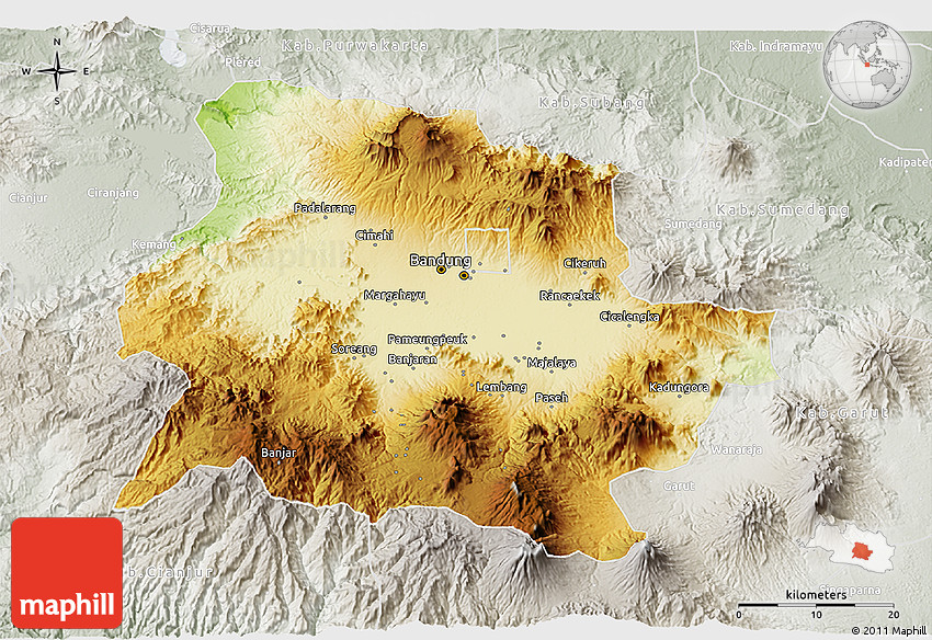 Physical map illustrates the mountains, lowlands, oceans, lakes and rivers and other physical landscape features of Kab. Bandung. Differences in land elevations relative to the sea level are represented by color.